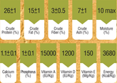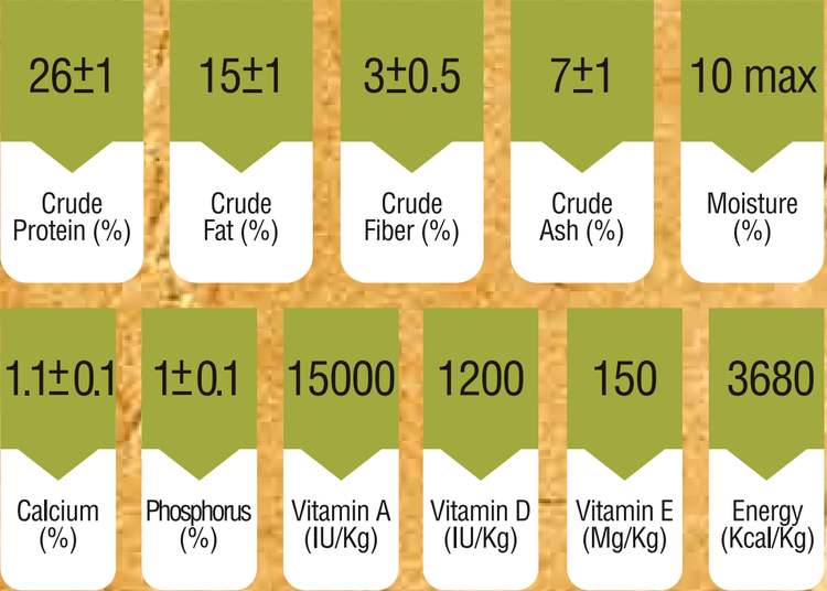 پروتئين طيور، پروتئين ماهی، برنج، بلغور جو دوسر، روغن ماهی، روغن گياهي، روغن طيور، پروتئين هيدروليز شده، تفاله چغندر خشک ساده، بذر كتان، فيبرنخود، مخمر هيدروليز شده، ذرت، گلوتن ذرت، گلوتن گندم، كلريد سديم، توكسين بايندر و ضد قارچ.