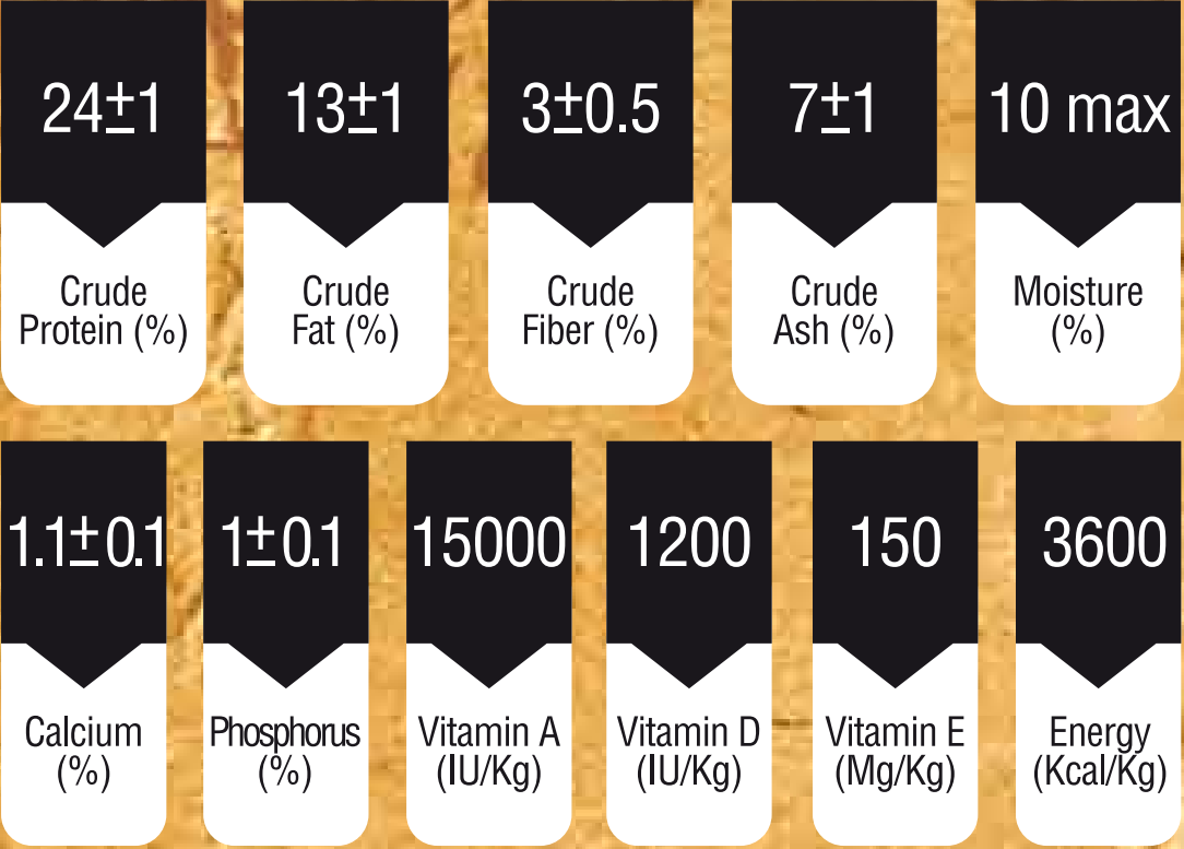 ويتامين A، ويتامينD3، ويتامين E، ويتامين K3، ويتامين B1، ويتامين B2، ويتامين B3، اسيد پانتوتنيک، ويتامين B6، بيوتين، اسيد فوليک، ويتامين B12، ويتامين C، تورين، ترئونين، ليزين، متيونين، كولين كلرايد، آهن، مس، منگنز، يد، فسفر، كلسيم، روی، سلنيوم، پروبيوتيک ها، پری بيوتيک ها، آنتی اكسيدان، ال كارنيتين و طعم دهنده های طبيعی.